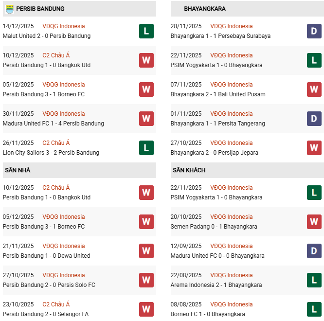 Thống kê phong độ Persib Bandung vs Bhayangkara: