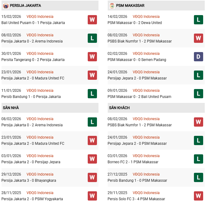 Thành tích đối đầu Persija Jakarta vs PSM Makassar: