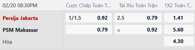 Thông tin tỷ lệ Persija Jakarta vs PSM Makassar: