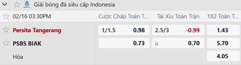 Thông tin tỷ lệ kèo Persita Tangerang vs PSBS Biak Numfor: