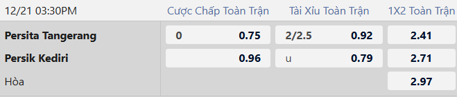 Thông tin tỷ lệ Persita vs Persik Kediri: