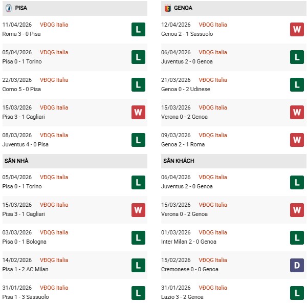 - Pisa hòa 2, thua 1 trong 3 trận đối đầu Genoa gần đây.