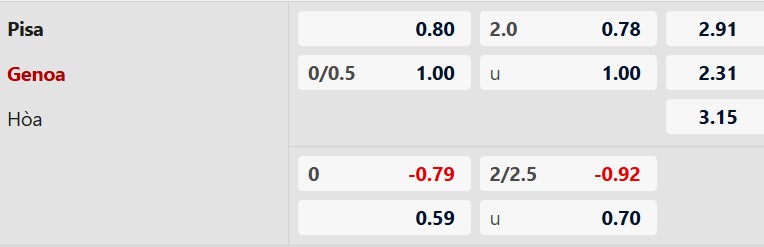 Thông tin tỷ lệ kèo Pisa vs Genoa: