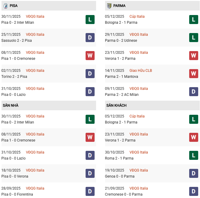 - Trên sân nhà, Pisa thắng 1, thua 1 trước Parma.