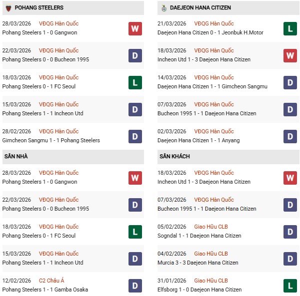 Nhìn rộng ra từ cuối K1-League 2025 tới giờ, Daejeon không thua ở 5/6 chuyến hành quân. Song bên kia chiến tuyến, Pohang đâu kém cạnh tại sào huyệt Steel Yard: cũng chỉ 1 thất bại sau 6 trận tại giải VĐQG Hàn Quốc.