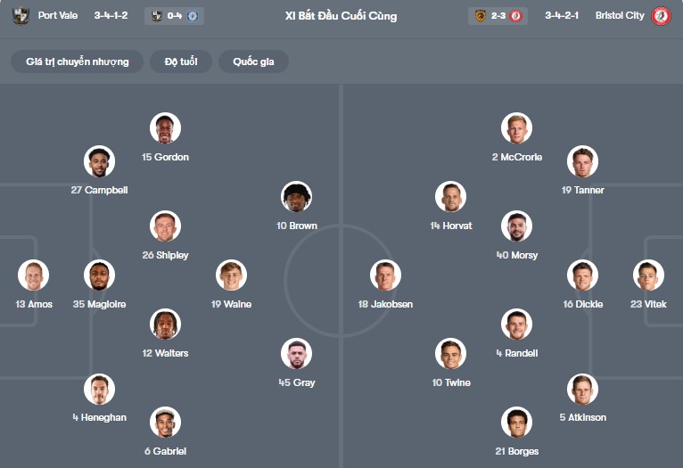 Đội hình dự kiến Port Vale vs Bristol City: