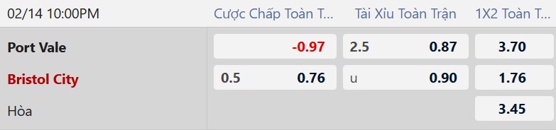 Thông tin tỷ lệ cược Port Vale vs Bristol City: