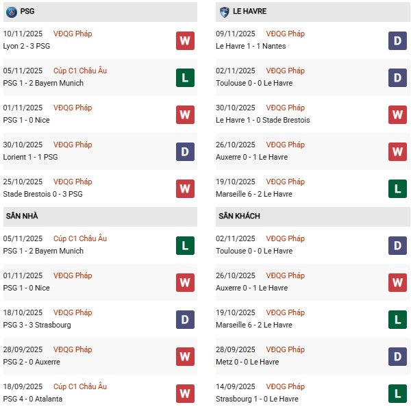 - Trên sân nhà, PSG thắng 4, hòa 1 trước Le Havre.
