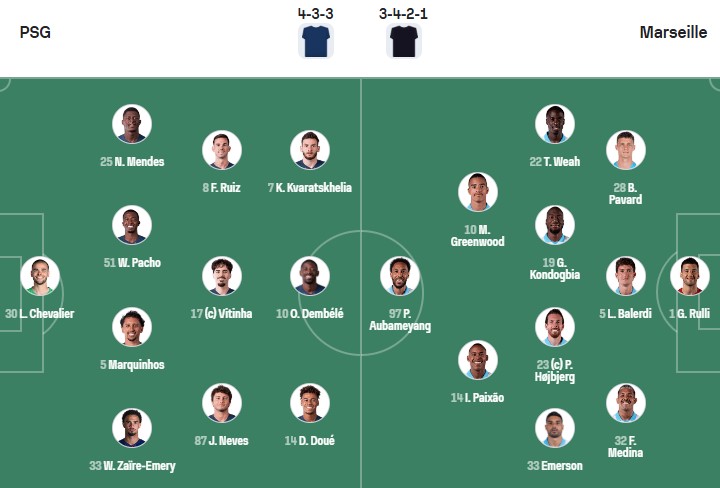 PSG bước vào trận đấu này với sự tỏa sáng rực rỡ của Desire Doue sau chấn thương. Tài năng trẻ người Pháp đã ghi 3 bàn ở 4 trận gần nhất cho đội bóng Thủ đô nước Pháp, sẽ cùng Quả bóng vàng và FIFA The Best 2025 Ousmane Dembele, dẫn dắt hàng công của PSG ở cuộc đối đầu với OM lần này.