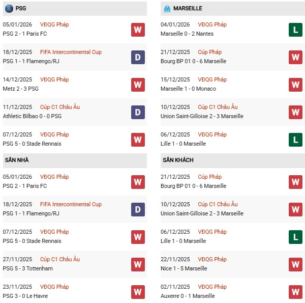 Thống kê phong độ PSG vs Marseille: