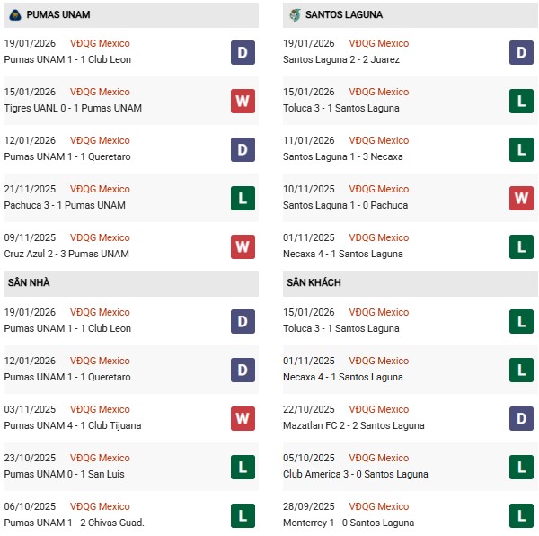 Đáng lo ngại hơn là màn trình diễn trên sân khách, nơi Santos Laguna hòa 2 và thua tới 8 trong 10 chuyến xa nhà gần đây. Hàng thủ thiếu chắc chắn khiến họ thường xuyên rơi vào thế bị động, đặc biệt trước những đội có xu hướng chơi tấn công như Pumas UNAM.