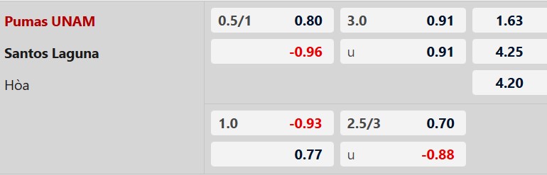 Với lợi thế sân nhà và vị thế hiện tại tốt hơn, Pumas UNAM được xếp cửa trên với mức chấp 3/4 bàn. Dù phong độ sân nhà không quá ấn tượng, nhưng việc Santos Laguna thi đấu rất kém trên sân khách khiến khả năng Pumas UNAM giành trọn 3 điểm là khá cao. Nếu duy trì được sức ép và tận dụng tốt cơ hội, đội chủ nhà hoàn toàn có thể thắng với cách biệt đủ để vượt kèo châu Á.