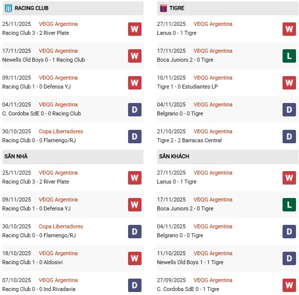 Thống kê phong độ Racing Club vs Tigre: