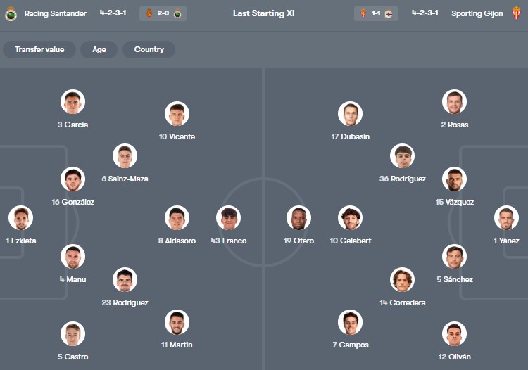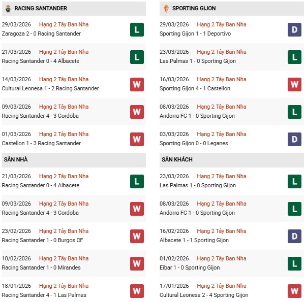 - Trên sân nhà, Racing Santander thắng 4, thua 2 trước Gijon.