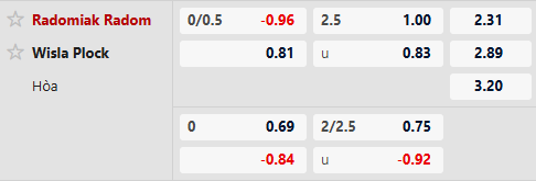 Thông tin tỷ lệ Radomiak vs Wisla Plock: