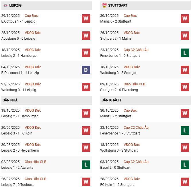 Thống kê phong độ RB Leipzig gặp Stuttgart: