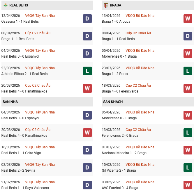 - Real Betis hòa 3, thua 1 trong 4 trận gặp Braga gần đây.