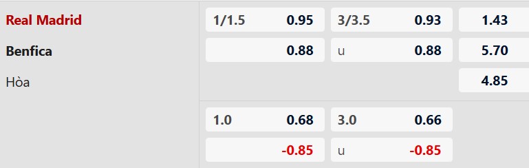 Thông tin tỷ lệ kèo bóng đá Real Madrid vs Benfica: