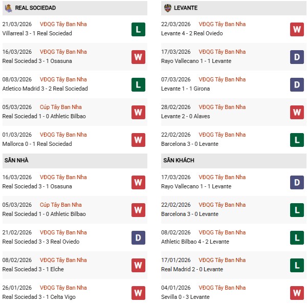 - Trên sân nhà, Real Sociedad thắng 4, thua 2 trước Levante.
