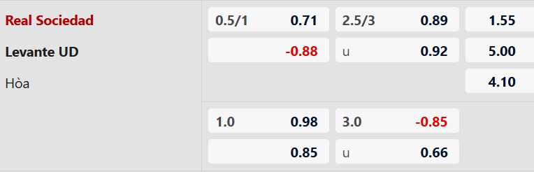 Thông tin tỷ lệ kèo Real Sociedad vs Levante: