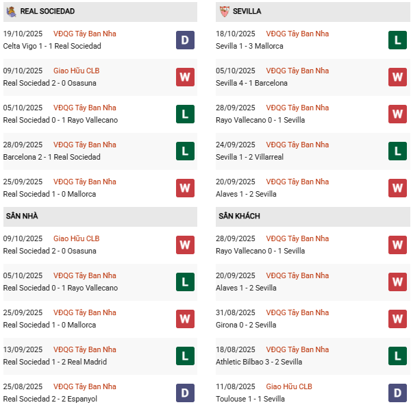 Thống kê phong độ Real Sociedad vs Sevilla: