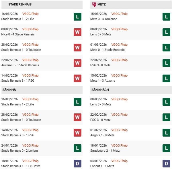 - Trên sân nhà, Rennes thắng 8, thua 1 trước Metz.