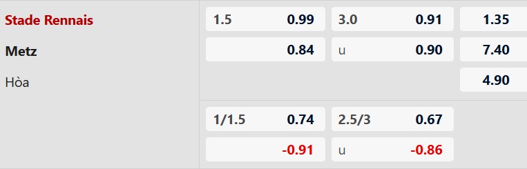 Thông tin tỷ lệ kèo Rennes vs Metz: