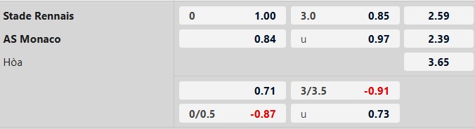Thông tin tỷ lệ cược Rennes vs Monaco: