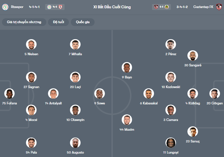 Đội hình dự kiến Rizespor vs Gaziantep: