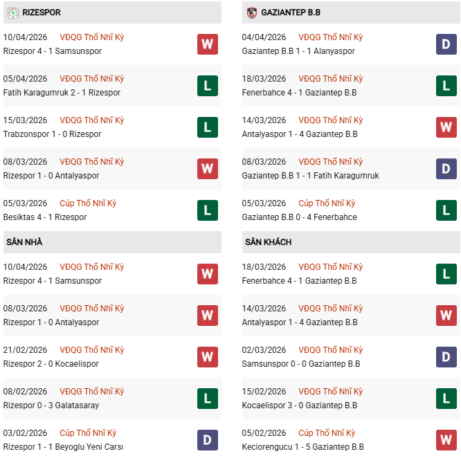 - Rizespor thắng 5, hòa 1, thua 4 trong 10 trận gặp Gaziantep gần đây.