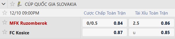 Thông tin tỷ lệ Ruzomberok vs Kosice:
