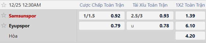 Thông tin tỷ lệ cược Samsunspor vs Eyupspor: