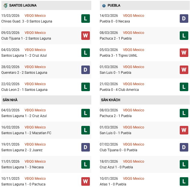 - Santos Laguna thắng 3, hòa 2, thua 5 trong 10 trận gặp Puebla gần đây.