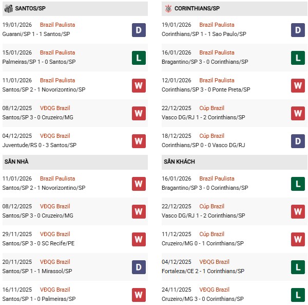 Đáng chú ý, Santos đang thể hiện bộ mặt rất ổn định trên sân nhà khi thắng 6, hòa 3 và chỉ thua 1 trong 10 trận gần đây. Lối chơi của Santos thiên về sự chắc chắn, ưu tiên kiểm soát thế trận và hạn chế rủi ro, đặc biệt trong các trận đấu lớn mang tính derby như cuộc đối đầu với Corinthians.