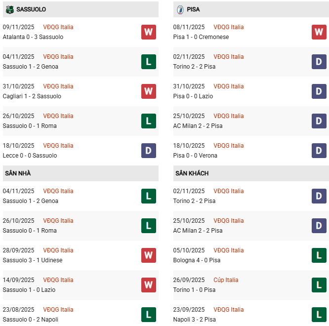 - Trên sân nhà, Sassuolo thắng 2, hòa 1 trước Pisa.