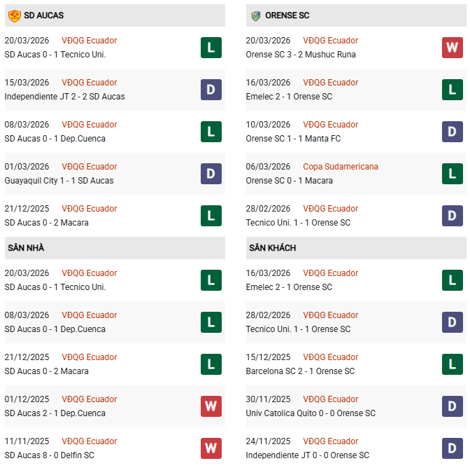 Trái ngược với sự rệu rã của đội chủ nhà, Orense SC đang cho thấy những tín hiệu lạc quan hơn hẳn. Họ vừa có chiến thắng kịch tính 3-2 trước Mushuc Runa vào ngày 20/03, điều này giúp tinh thần toàn đội lên cao sau chuỗi trận hòa và thua sát nút. Mặc dù thành tích sân khách của Orense chưa thực sự bùng nổ (thua Emelec 1-2 và hòa Tecnico Uni 1-1), nhưng họ vẫn duy trì được lối chơi có nét và khả năng ghi bàn đều đặn hơn so với đối thủ. Với việc chỉ thua 1/4 trận gần nhất tại giải quốc nội, Orense SC đang cho thấy mình là một đối thủ cực kỳ khó chịu và sẵn sàng tận dụng sự khủng hoảng của Aucas để giành lấy điểm số.