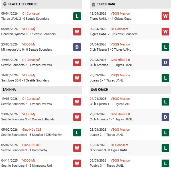 - Seattle thắng 2, thua 2 trong 4 trận gặp Tigres UANL gần đây.