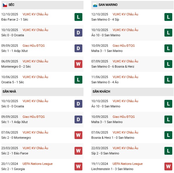 - Séc toàn thắng trong 6 trận gặp San Marino gần đây.