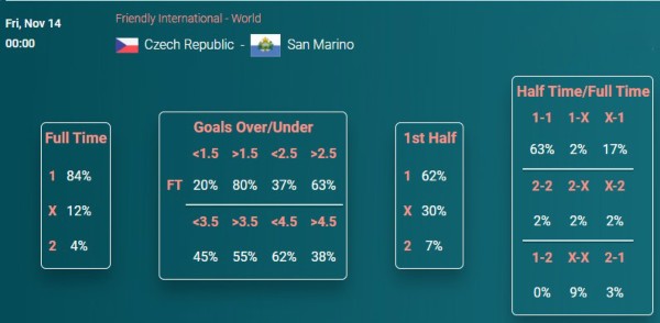 Trên sân khách, San Marino thường vỡ trận sớm và ít khi có cơ hội phản kháng. Họ nhiều khả năng sẽ chơi phòng ngự số đông, tập trung phá bóng và kéo dài thời gian. Tuy nhiên, trước sức ép dồn dập từ đối thủ vượt trội mọi mặt như Séc, khả năng giữ sạch lưới trong hiệp 1 gần như là không thể.
