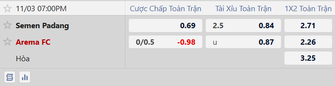 Thông tin tỷ lệ Semen Padang đấu với Arema: