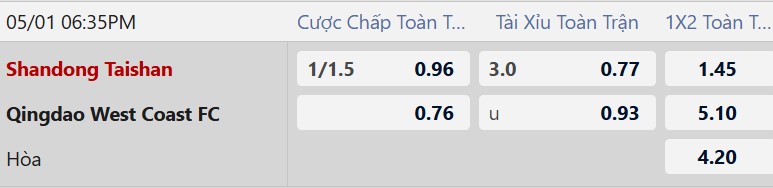 Mức chấp 1 1/4 bàn phản ánh sự chênh lệch rất lớn về đẳng cấp và hỏa lực giữa hai đội. Shandong Taishan buộc phải thắng đậm để nhanh chóng khỏa lấp khoảng cách điểm số bị trừ, trong khi Qingdao West Coast lại đang có dấu hiệu hụt hơi khi đá sân khách. Dù đội khách có lối chơi thiên về phòng ngự, nhưng trước sức ép nghẹt thở tại Jinan, khả năng hệ thống của HLV Zheng Zhi bị đánh sập là rất cao. Một chiến thắng cách biệt cho đội chủ nhà là kịch bản hoàn toàn khả thi.