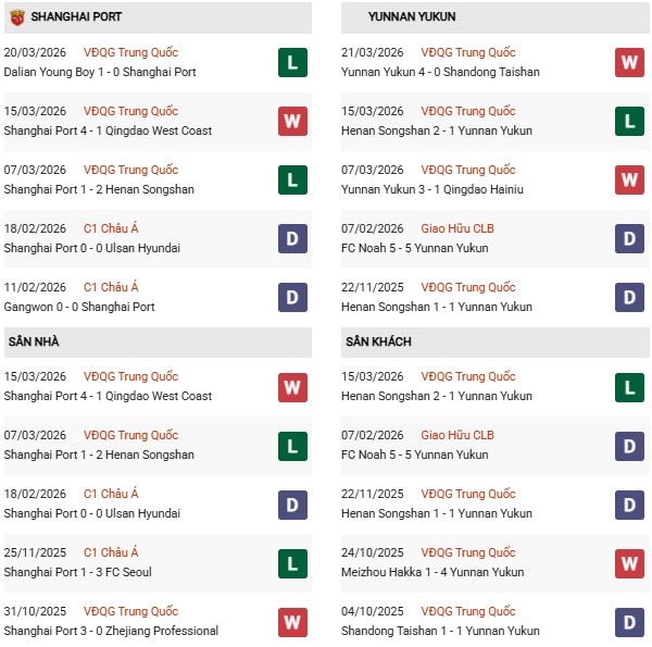 Thành tích đối đầu Shanghai Port vs Yunnan Yukun: