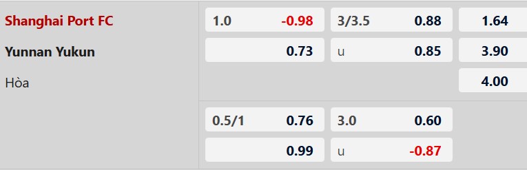 Thông tin tỷ lệ Shanghai Port vs Yunnan Yukun: