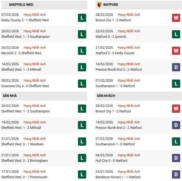 - Trên sân nhà, Sheffield Wednesday thắng 2, thua 5 trước Watford.