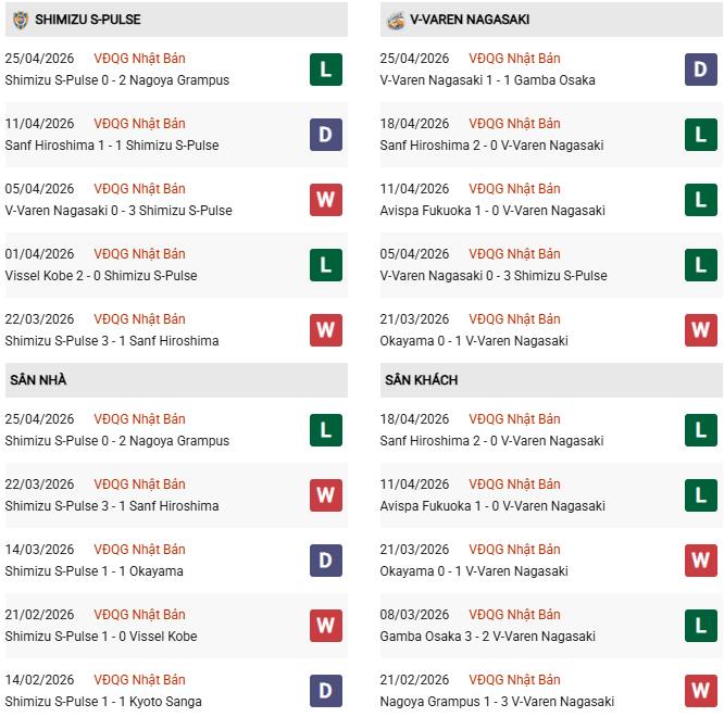 V-Varen Nagasaki mới ghi được 11 bàn sau 12 trận tại J1-League 2026, tức trung bình chưa đến 1 bàn/trận. Trong khi đó, Shimizu S-Pulse không khá hơn bao nhiêu: 13 bàn/12 trận. Thống kê cũng chỉ ra 3/4 trận gần đây của Shimizu và 4/5 lần xuất quân mới nhất của V-Varen đều có dưới 3 pha lập công.