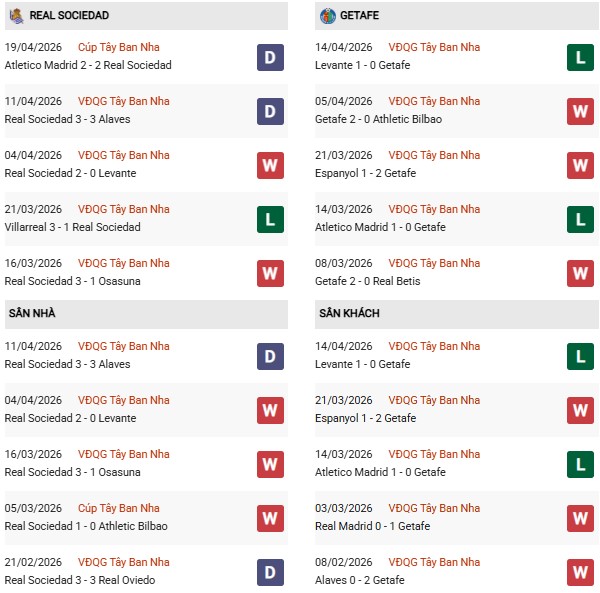 Thống kê phong độ Sociedad vs Getafe: