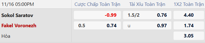 Thông tin tỷ lệ Sokol Saratov vs Fakel: