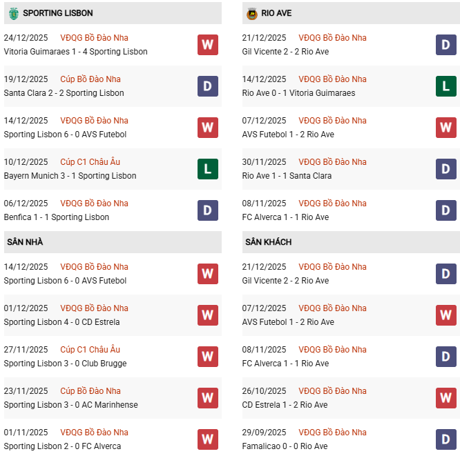 Sporting Lisbon vẫn đứng thứ hai và kém Porto 5 điểm (38 so với 43) kể từ vòng 13 khi họ hòa 1-1 với kình địch Benfica trong trận derby Lisbon hồi đầu thắng 12 này. Một chiến thắng trước Rio Ave sẽ giúp thu hẹp khoảng cách, ít nhất là cho đến khi đội đầu bảng tiếp đón đội cuối bảng AVS ra sân vào ngày hôm sau.