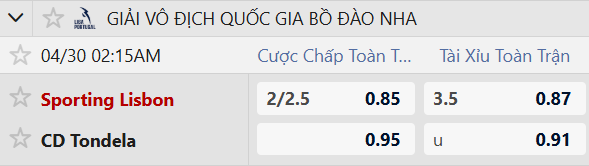Thông tin tỷ lệ kèo Sporting Lisbon vs Tondela: