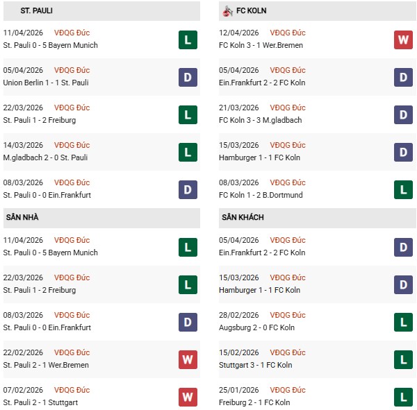 - Trên sân nhà, St. Pauli thắng 1, thua 4 trước FC Koln.